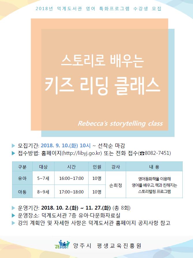 양주시 덕계도서관은 오는 10월 2일부터 영어 특화프로그램 ‘스토리로 배우는 키즈 리딩 클래스’를 운영한다고 밝혔다.