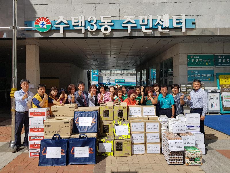 구리시(시장 안승남) 수택3동에서는 지난 9월 12일(수) 6개 기간단체가 어려운 이웃을 위하여 정성껏 준비한 성품을 전달하였다.