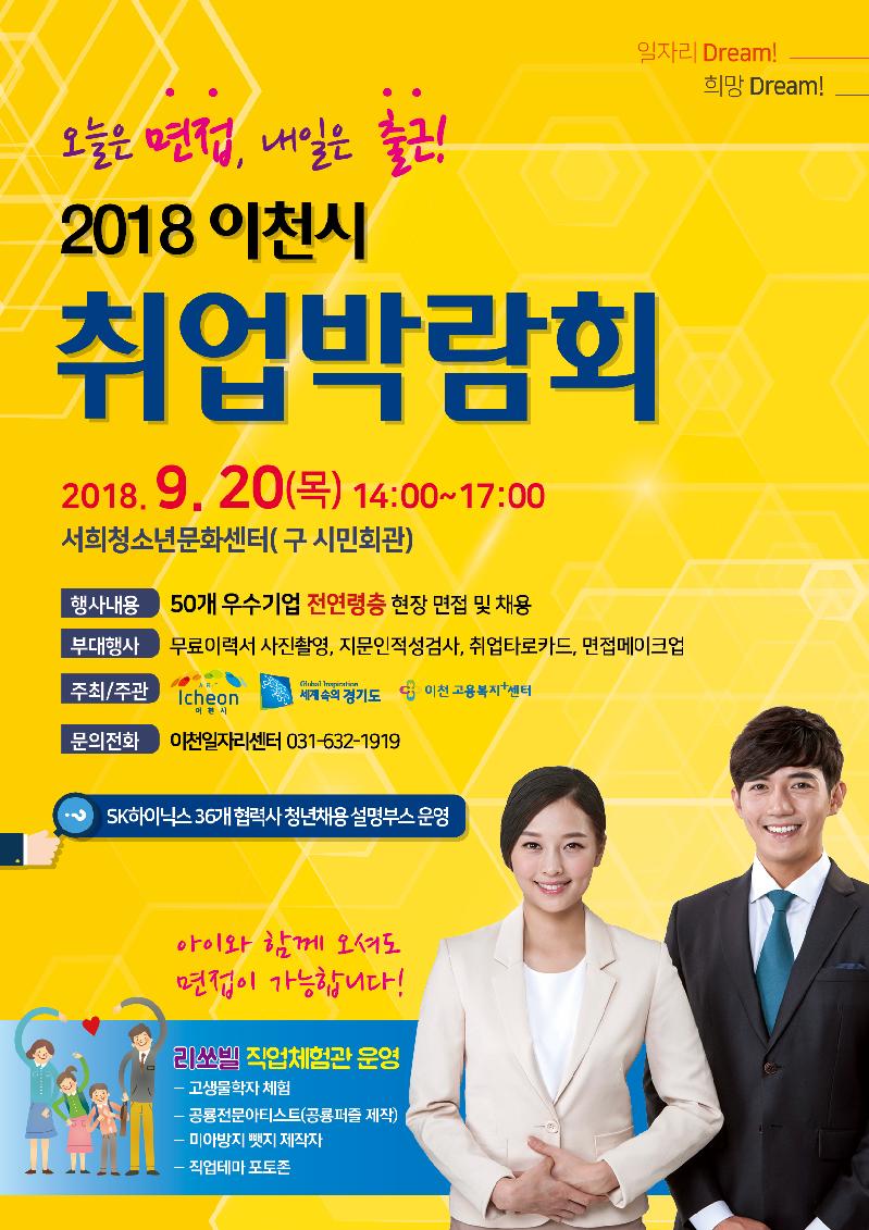 이번 취업박람회는 이천시와 경기도가 주최하고 이천고용복지플러스센터가 공동주관하며, 이천시가 연중 가장 대규모 개최하는 취업박람회로 OB맥주, 팔도, 콘티넨탈오토모티브시스템, 샘표식품, 시몬스(침대), 뉴트리바이오텍 등 지역의 우수한 50개 기업이 참여한 가운데 사무‧관리‧서비스‧물류․생산직 등의 다양한 분야에서 350명을 채용할 예정이다.