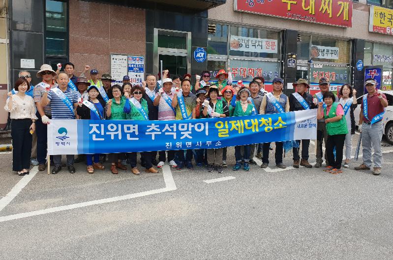 평택시 진위면은 민속명절 추석을 맞이하여 고향을 찾는 시민들에게 쾌적하고 깨끗한 도심환경을 제공하고자 지난 12일 이장협의회 등 각 단체장 및 회원 30여명과 합동으로 진위역 일원에서 일제 대청소를 실시하여 무단 투기된 1톤가량의 생활쓰레기와 불법광고물을 수거했다.