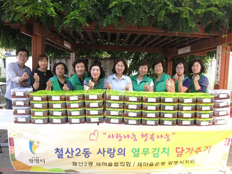 광명시 철산2동 새마을부녀회(회장 도정임)는 지난 12일 회원들이 직접 담근 열무김치를 독거노인, 장애인 등 저소득계층 100가구에 전달했다.