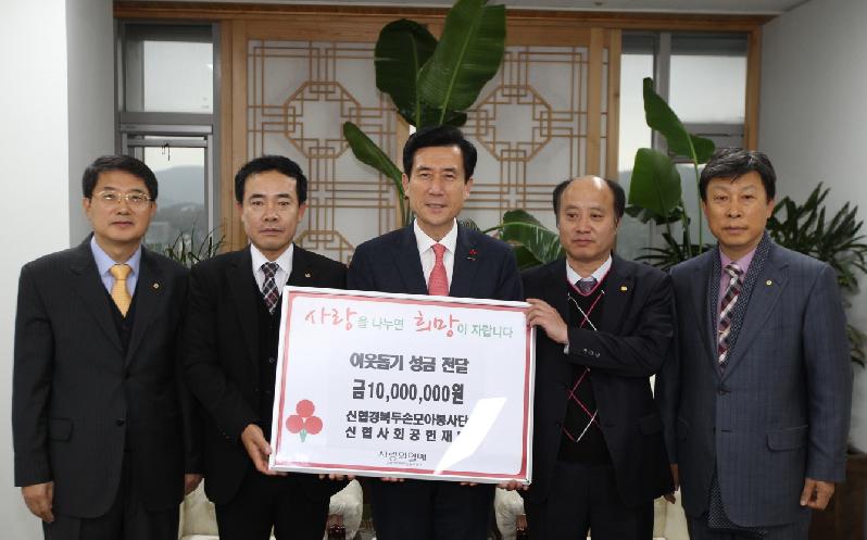 신협 경북두손모아봉사단(단장 정영수)이 지난11일 포항시청을 방문해 희망복지지원단과 함께 이웃돕기 성금 1,000만원을 관내 저소득층과 다문화가정에게 전달했다. 정영수 단장은 “연말연시를 맞아 어렵게 생활하는 주위 이웃들에게 따뜻한 마음이 전해지길 바란다”며 “앞으로도 지역 소외계층에게 많은 관심을 가지고 이웃사랑을 실천 할 수 있도록 노력하겠다”고 말했다. 이 자리에서 이강덕 포항시장은 “지역 소외계층에게 많은 도움이 될 것이며, 앞으로도 나눔과 사랑 실천으로 행복동행에 함께 해주기를 바란다”며 감사의 뜻을 전했다. 한편 신협 봉사단은 경북지역내 단위신협의 전무‧상무 등 실무책임자로 구성된 봉사단체로, 신협사회공헌재단(이사장 문철상)과 더불어 신협 사회공헌활동 사업의 대표적 단체이며, 매년 무료급식봉사, 김장담그기, 연탄후원 등 지속적인 사회공헌활동을 펼치고 있다.