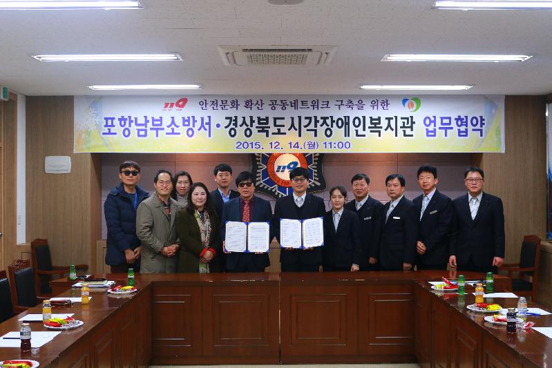 포항남부소방서(서장 김학태)는 14일 본서2층 회의실에서 경상북도시각장애인복지관과 안전문화 확산 공동네트 워크 구축 업무협약을 체결하였다. 이날 업무협약은 도민을 대상으로 안전문화 확산을 위한 공동네트 워크를 구축하고자 마련하였으며 ▲중증시각장애인 주택 기초소방시설 보급 및 생필품 지원 ▲소 ·소·심 등 소방안전교육▲ 겨울철 화재예방 홍보 캠페인 등에 관해 협력하기로 하였다. 포항남부소방서는 이번 업무협약이 안전문화 확산의 계기가 되기를 기대해본다고 밝혔다.