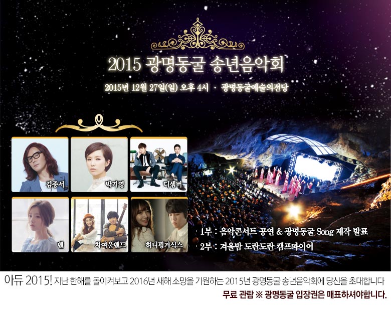 2015년 대한민국 최고의 동굴테마파크로 우뚝 선 광명동굴의 성공을 축하하는‘광명동굴 송년음악회’가 오는 27일(일) 오후 4시 동굴예술의전당에서 열린다.