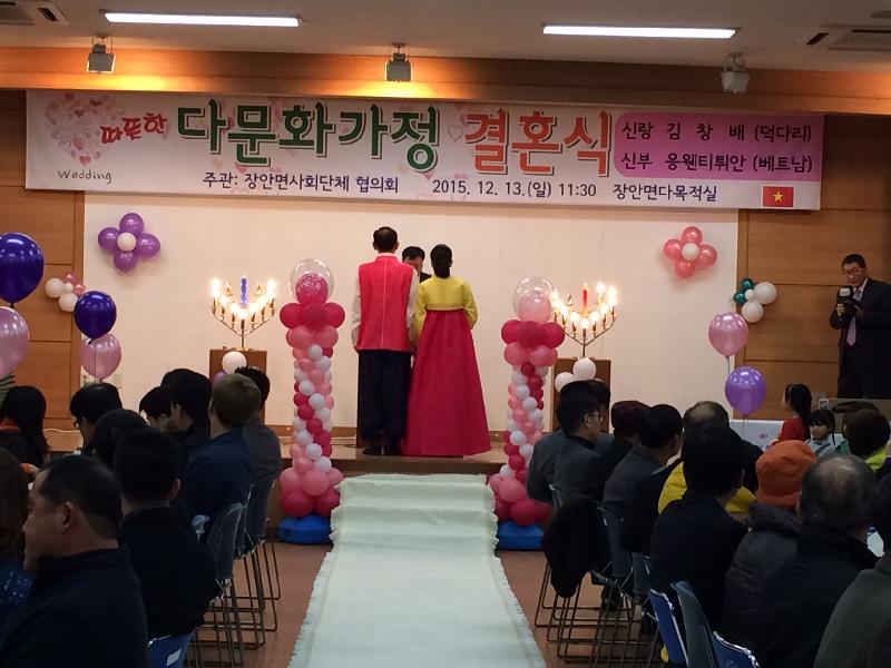 다문화 가정 부부를 위한 결혼식이 지난 13일 화성시 장안면 사회단체협의회 주관으로 면사무소 다목적집회장에서 열렸다.