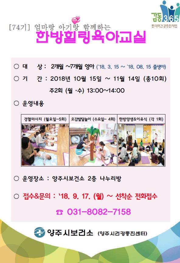 양주시 보건소는 오는 10월 15일부터 11월 14일까지 엄마랑 아기랑 함께하는 제74시 한방힐링 육아교실을 운영한다고 밝혔다.