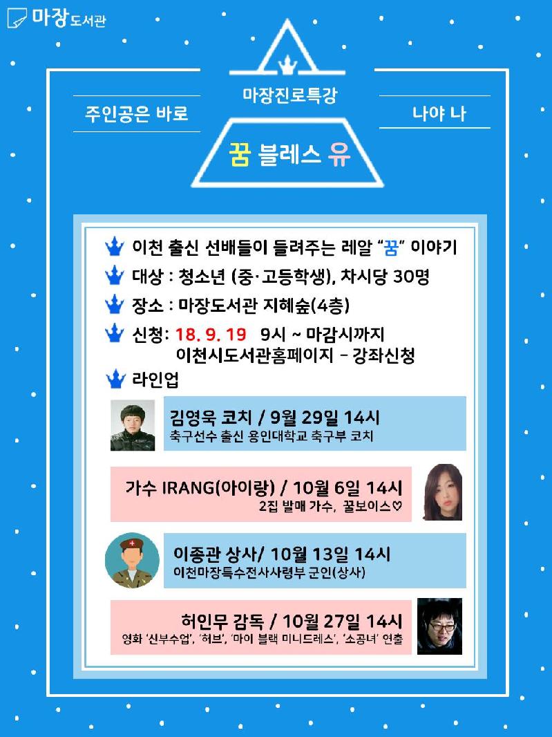 이천마장도서관은 9월 29일부터 10월 27일까지 4회에 걸쳐 청소년들을 위한 진로특강을 개최한다.