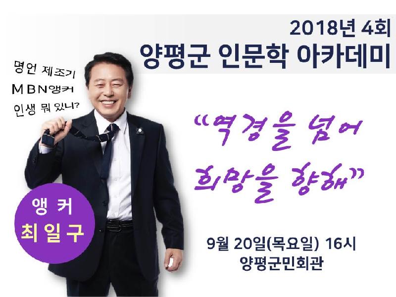 양평군은 오는 20일 오후 4시부터 양평군 군민회관에서 최일구 앵커의 ‘역경을 넘어 희망을 향해’라는 주제로 2018년 ‘제4회 소통 인문학 아카데미’를 개최한다.