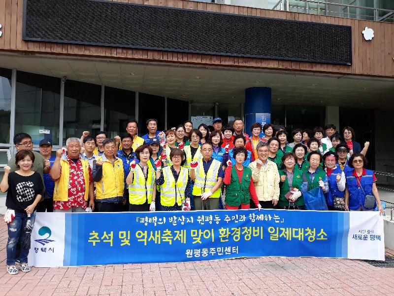 평택시 원평동주민센터는 민족의 대명절 추석을 맞아 지난 14일 원평동 12개 단체 회원 80여 명이 참여한 가운데 『추석 및 억새축제 맞이 환경정비 일제대청소』를 실시했다.