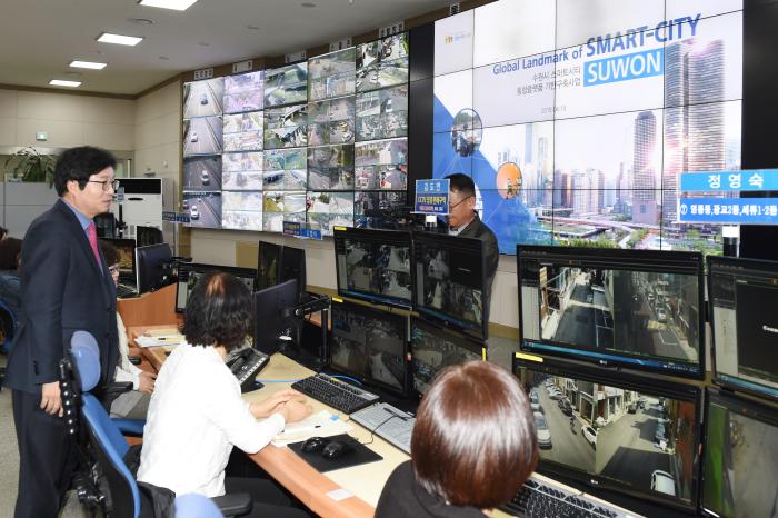 지난 4월 ‘스마트시티 CCTV 통합플랫폼’을 시찰하는 염태영 시장. 수원시가 ‘스마트시티’를 조성해 미래도시 건설에 한발 앞장서 나간다. 스마트시티는 첨단 정보통신기술(ICT)을 공공서비스에 적용해 공공기능을 네트워크화한 도시를 말한다. 이른바 ‘똑똑한 도시’로 언제 어디서나 인터넷을 접속할 수 있고, 첨단 IT 기술을 자유롭게 사용할 수 있는 미래형 첨단도시다. 수원시는 23일 아주대학교 율곡관에서 열린 ‘수원형 스마트시티 정책포럼’에서 추진 중인 스마트시티 사업을 소개했다. 대표적인 스마트시티 사업은 ▲IoT(사물인터넷) 기반 스마트빌딩 에너지·환경 관리시스템 ▲스마트 레인시티 수원 ▲스마트시티 통합플랫폼 ▲수원 스마트워터 상수도 고도화시스템 ▲스마트 기술을 활용한 도시재생뉴딜사업 등이다. 수원시 공공건물에 구축한 ‘IoT 기반 스마트빌딩 에너지·환경 관리 플랫폼’은 프로토콜(통신 시스템이 데이터를 교환하기 위해 사용하는 통신 규칙)을 바탕으로 빌딩 설비와 스마트 플랫폼을 실시간으로 연동하는 것이다. 스마트 플랫폼에서 건물 설비·환경·공간·에너지 데이터를 수집하고, AI(인공지능)를 활용해 건물 운영을 최적화할 수 있다. ‘스마트 레인시티 수원’은 사람·물·자연이 함께하는 물 순환도시를 만들기 위해 도시 전반에 자연 상태에 근접한 물순환 구조를 만드는 정책이다. 버려지는 빗물을 재활용하기 위한 빗물 공급장치와 노면 살수 시스템, 지하수 오염물질을 줄여주는 LID(저영향 개발) 시설 등이 대표적인 레인시티 사업이다. 수원시는 기존 인프라에 IoT·빅데이터 등 최첨단 기술을 적용해 더욱 ‘스마트하게’ 사업을 추진하고 있다. 스마트레인시티 통합관리시스템은 빗물 이용 솔루션, 대기 환경 개선 솔루션, LID 시설 관리 솔루션 등으로 구성된다. 물순환 시설을 원격제어하고, 관련 빅데이터를 수집해 시민과 기관에 정보를 제공한다. ‘스마트시티 CCTV 통합플랫폼’은 경찰서, 소방서 등에 사건·사고가 접수되면 수원시 도시안전통합센터가 사건·사고 지점 주변의 영상을 해당 기관에 제공해 경찰·소방관들이 즉각적으로 상황을 파악하고 대처해 골든타임을 확보할 수 있도록 하는 것이다. 통합플랫폼은 ▲112 긴급영상 지원서비스 ▲112 긴급출동 지원서비스 ▲119 긴급출동 지원서비스 ▲재난안전상황 긴급대응 지원서비스 ▲사회적 약자 지원서비스 등 5대 연계서비스를 제공한다. 스마트 CCTV 통합플랫폼 구축으로 납치·강도·폭행 등 긴박한 사건·사고가 발생했을 때 경찰이 더욱 신속하게 대응할 수 있게 됐다. 도시안전통합센터는 경찰 실시간으로 사건·사고 현장 사진, 범인 도주 경로 정보, 증거 자료 등을 제공한다. 현재 구축 중인 ‘수원스마트워터 상수도고도화시스템’은 수돗물 생산부터 공급까지 전 과정에 정보통신기술을 접목해 물관리 체계를 구축하는 것이다. 고도화시스템이 구축되면 데이터의 분석결과와 정확한 수리(水利)·수질 모의정보를 파악할 수 있어 효율적이고 과학적으로 상수관망을 운영할 수 있다. 과학적으로 수집한 데이터를 기반으로 상수도 시설을 운영해 수자원·에너지·운영비를 절감할 수 있을 것으로 보인다. 또 상수도 시설물·데이터를 원격으로 감시하고 제어할 수 있어 이상 징후가 발생하면 신속하게 대응할 수 있고, 시설물에 관한 종합 분석결과도 볼 수 있어 시설물 상태를 쉽고 정확하게 진단할 수 있다. 시민들이 수돗물 수질을 실시간으로 확인할 수 있게 돼 음용률도 높아질 것으로 보인다. ‘스마트 기술을 활용한 도시재생뉴딜사업’은 도시재생사업에 다양한 스마트 기술을 적용하는 것이다. ‘스마트도시 안전망’, ‘스마트 주차장’, ‘스마트 가로등’, ‘감응(感應)식 교통신호’ 등이 도시재생사업에 접목할 수 있는 스마트 기술이다. 수원시는 내년 2월부터 ‘수원시 스마트도시 기본계획’을 수립할 예정이다. 수원시는 지난 7월 조직개편에서 스마트시티 정책을 담당하는 ‘스마트시티팀’을 신설한 바 있다. |