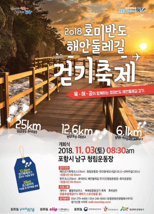 포항시가 한반도 최동단의 아름다운 해안을 따라 기암절벽과 파도소리를 함께 즐길 수 있는「2018 호미반도 해안둘레길 걷기축제」행사를 오는 11월 3일 개최한다.