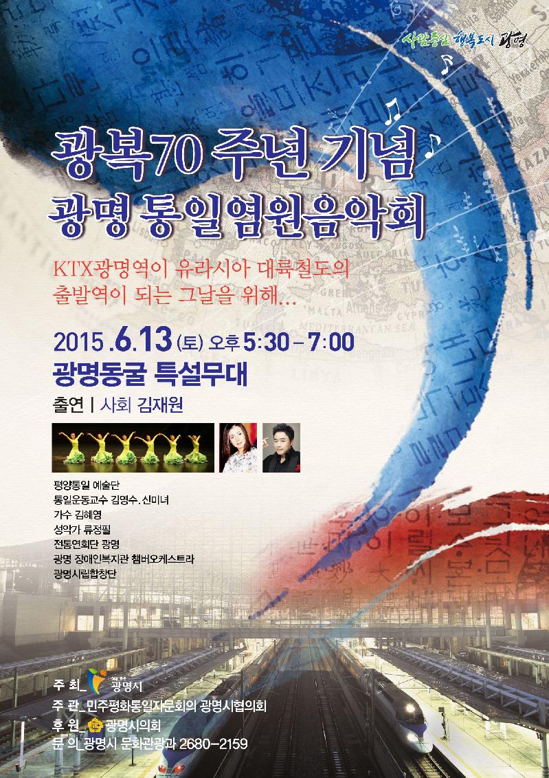 양기대 광명시장은 “광복70주년 통일염원음악회를 통해 시민 모두가 함께 통일을 염원하고 특히 KTX광명역이 꼭 유라시아 대륙철도의 출발역이 돼 통일한국의 심장 역할을 할 수 있기를 기원해본다.”고 말했다.