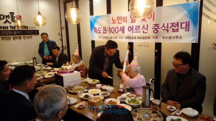 이날 행사에는 화도읍 지역내 100세 이상 어르신들 중 외출과 거동이 가능하신 분들과 화도읍 이장협의회장, 주민자치위원장, 복지넷위원장 등 지역 사회단체장들이 함께 참석하여 어르신들의 건강과 장수를 기원하며 훈훈한 식사 자리를 갖고 장수지팡이와 마음을 담은 용돈을 전달했다.