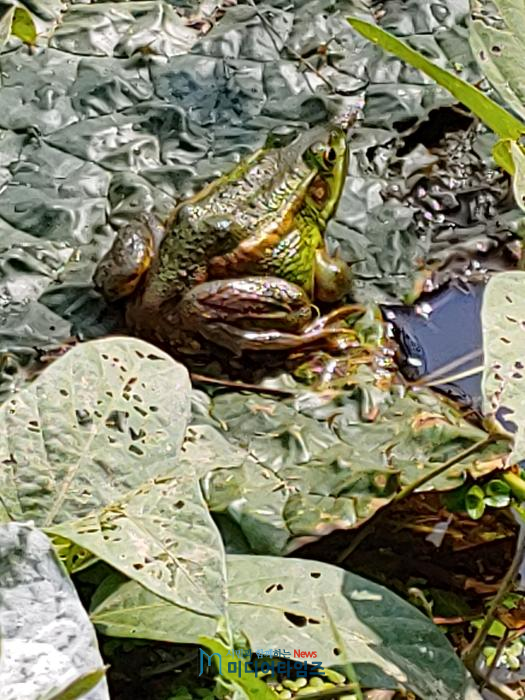 | 가시연 위에 앉아있는 금개구리 모습. |