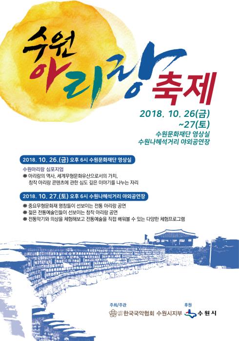 한국국악협회 수원시지부가 주관하고 수원시가 후원하는 ‘수원아리랑축제’는 ‘수원아리랑’을 주제로 ▲수원아리랑 심포지엄 ▲중요무형문화재 명창들의 전통 아리랑 공연 ▲젊은 전통예술인들의 창작 아리랑 공연 ▲전통악기 체험 등 다양한 행사 프로그램이 진행될 예정이다.