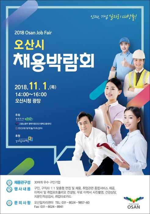 오산시(시장 곽상욱)는 오는 11월 1일 오후 2시 오산시청 광장에서 일할 수 있는 능력과 의욕을 가진 구직자에게 관내 우수기업을 알리고 우수한 인재를 채용하며, 기업체에 인력수급 및 고용 확대의 기회를 제공하고자 「2018년 오산시 취업박람회」를 개최한다고 밝혔다.