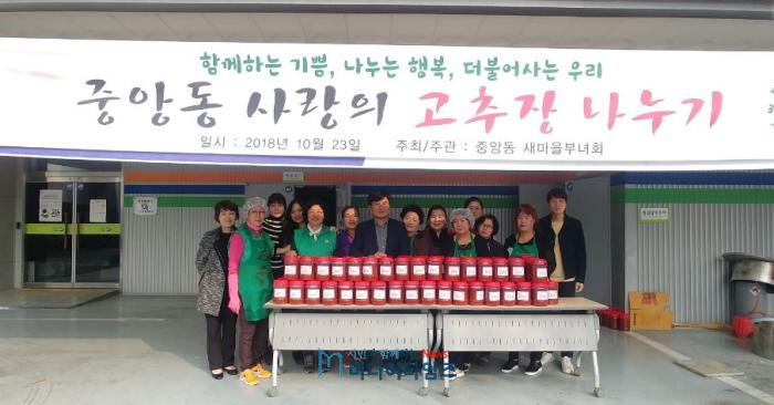 김분남 중앙동 새마을부녀회장은 “정성스럽게 만든 고추장을 홀로 사는 어르신들과 어려운 이웃들이 맛있게 드셨으면 좋겠다.”며 “앞으로도 더불어 사는 따듯한 마을 조성을 위해 작은 힘이라도 보탬이 되도록 지속적으로 노력하겠다.”고 말했다.
