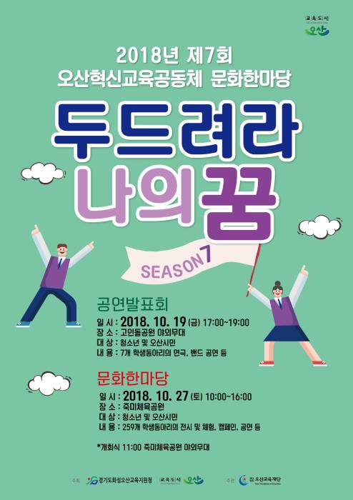 오산시(시장 곽상욱)와 경기도화성오산교육지원청(교육장 방용호)이 주최하고 (재)오산교육재단이 주관하는 2018년 제7회 오산혁신교육공동체 문화한마당 『두드려라 나의 꿈 SEASON7』이 오는 27일 죽미체육공원에서 개최된다.