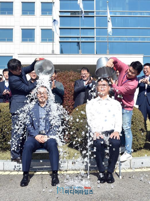 경기도교육청 유대길 행정국장과 김주영 대변인이 25일 루게릭병(근위축성 측색 경화증) 환우를 위한 기부에 동참하고 아이스버킷 챌린지 인증을 실천했다. 지난 16일 경기도교육정보기록원 이정만 원장이 아이스버킷 챌린지 릴레이 주자로 유대길 행정국장과 김주영 대변인을 지목하여 진행된 이 기부 행사의 기부금은 우리나라 최초의 루게릭병 요양병원 건립을 추진하고 있는‘승일희망재단’에 전달한다. 김주영 대변인은 고찬석 경기도의회 제1교육위 부위원장도 릴레이 주자로 지목한 바 있다.