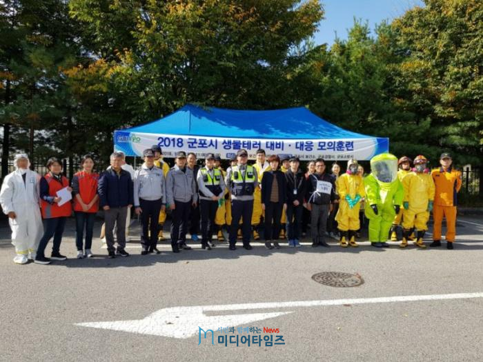 군포시는 지난 24일 보건소 민원실에 백색가루 형태의 생화학 물질에 의한 테러가 발생한 상황을 가정해 경찰․소방과 합동으로 생물테러 대비․대응 훈련을 진행했다.