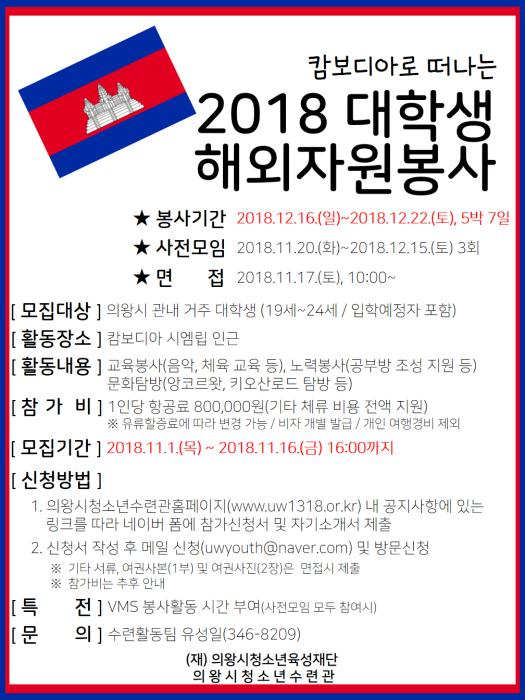 의왕시청소년수련관(관장 박민재)은 다음달 1일부터 캄보디아 해외자원봉사 활동에 참여할 대학생 자원봉사자를 모집한다.