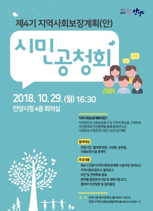 안양시(시장 최대호)는 오는 29일(월) 제4기(2019년~2022년) 지역사회보장계획 수립을 위한 시민공청회를 개최한다.