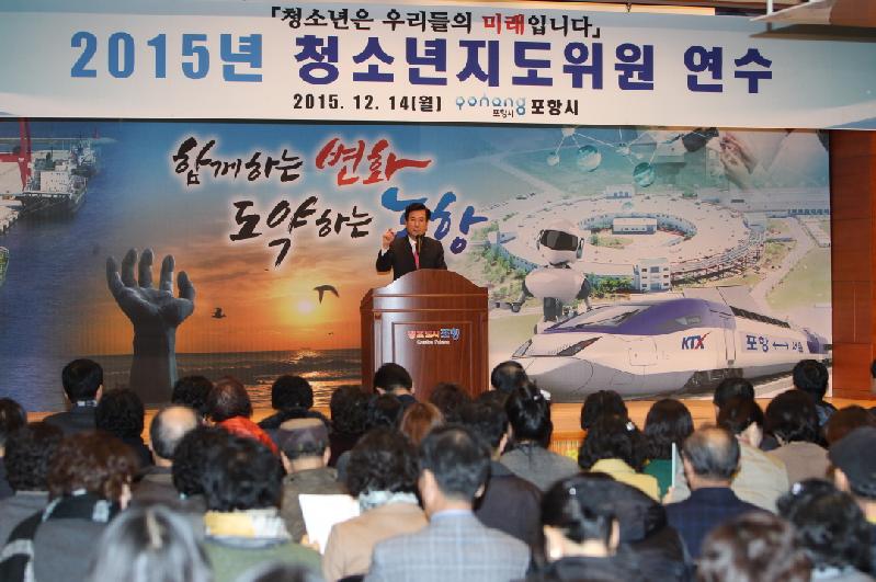 포항시가 14일 시청 대회의실에서 청소년지도위원들을 대상으로 ‘2015년 포항시 청소년지도위원 연수’를 실시했다. 청소년지도위원은 청소년지도사, 청소년지도 및 청소년육성 등에 관한 전문지식이 있거나 경험이 있는 사람 또는 주민으로부터 존경을 받고 사회적 신망이 두터운 사람 중에서 관할 지역 청소년단체의 장, 사회복지단체의 장, 학교장, 읍면동장 또는 경찰관서장의 추천을 받아 시장이 위촉하며, 읍면동별로 10명 내외로 구성되어 있으며 현재 324명이 포항시 지도위원으로 활동하고 있다. 이날 연수에서는 올해 청소년 지도위원들의 활동보고와 함께 청소년 보호와 복지증진에 많은 기여를 한 우수 지도위원 11명에게 포항시장 표창이 수여됐다. 이어 21C청소년가족복지연구소 도기봉 소장이 ‘청소년의 이해와 소통’ 이라는 주제로 특강을 실시했다. 도기봉 소장은 “청소년의 마음을 먼저 알아야 청소년을 지도 할 수 있다”며 “그들의 입장에서 생각하고 고민하고 위로하는 마음을 갖고 청소년 지도에 나서는 명품 지도위원의 길을 가야한다”고 당부했다. 이날 참석한 이강덕 포항시장은 “청소년은 미래의 주역일 뿐만 아니라 오늘을 살아가는 사회의 구성원”이라며 “한 나라의 장래를 보려면 그 나라의 청소년을 보라고 하듯이 청소년을 바르고 건강하게 키우는 일은 곧 우리 사회의 희망을 키우는 일임을 인식하고, 청소년지도위원들과 우리 모두가 청소년들에 대한 현실을 같이 고민하고 더 나은 대안을 마련하는 계기가 되기를 바란다”고 말했다. 한편 청소년지도위원은 △청소년의 보호·선도 및 건전생활의 지도 △청소년 수련활동의 여건 조성 및 장려 △청소년단체의 활동지원 △지역사회의 청소년 유익환경 조성 △우범 청소년과 청소년 유해환경업소 등에 대한 선도 및 지도 △불우 청소년 가정의 부조·지원 등 지역 청소년의 건전한 성장을 위해 다양한 활동을 펼치고 있다.