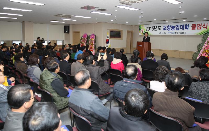 포항시가 14일 농업기술센터 흥해청사에서 올해 농업대학 졸업식을 갖고, 180명의 수료생을 배출했다. 포항농업대학은 지역 농업인들이 농업전문가로서의 역량을 키워 부농의 꿈을 이루고, 귀농귀촌이나 도시농부를 열망하는 도시민들이 기초영농 지식과 농촌·농업 관련 정보를 체계적으로 습득해 안정적인 농촌정착을 할 수 있도록 제도적으로 뒷받침하기 위해 운영하는 1년 과정의 평생교육 프로그램이다. 지난 2006년 개설해 올해로 10년째를 맞는 농업대학은 성인교육의 특성을 살려 농작물의 기본 이론과 작목별 최신 농업기술정보, 선진농업현장 벤치마킹, 영농실습 등의 교육과정으로 이뤄지며 사과, 경영마케팅, 귀농․귀촌, 도시농업 4개 과정으로 편성돼 연간 100시간을 이수하고, 70%이상을 출석해야 졸업이 가능하다. 포항농업대학은 뜻있는 농업인들을 위한 이론적 지식기반 위에 핵심기술 습득에 도움을 주는 등 전문 농업경영인으로 발돋움하는데 큰 역할을 했으며, 개설 이래 올해까지 1,241명의 졸업생을 배출했다. 특히 급증하는 귀농‧귀촌과 도시농부 열풍에 대응해 2013년부터 개설된 귀농·귀촌, 도시농업 과정은 베이비부머 세대 은퇴자들과 50대 주부들로부터 각광을 받고 있다. 이날 참석한 이강덕 포항시장은 “전 세계 경기불황으로 인한 저성장과 FTA, 소비침체, 가격 불안정 등 중첩된 어려움 속에서 농업인들이 자발적으로 전문기술과 경영능력을 키우는 것은 지역농업의 백년대계를 위한 기초체력을 튼튼히 다지는 것이며 새 희망을 불어넣는 일”이라며, “농업은 세계적인 투자전문가 짐 로저스도 손꼽았을 만큼 유망한 미래산업”이라고 강조했다. 또한 “단순한 먹거리 생산에서 가공․유통 서비스 등 2․3차 산업과 결합하고 마인드와 재능을 가진 귀농인력 등과 융합해 ‘치유’, ‘교육’, ‘예술’ 등의 콘텐츠 상품으로 개발되면 훌륭한 창조 비즈니스 모델로 성장할 수 있을 것”이라고 말했다.