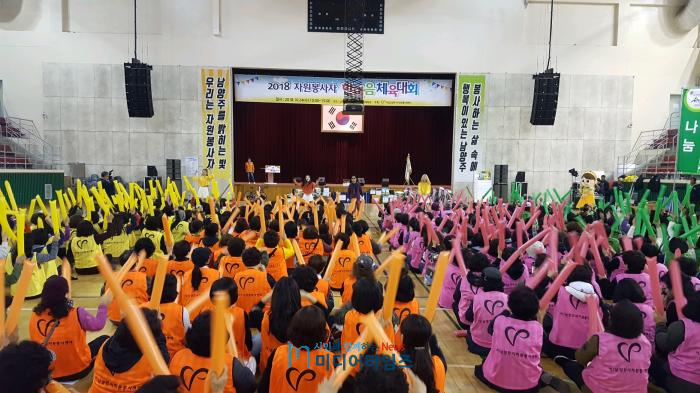 2018 자원봉사자 한마음 체육대회는 1부 기념식, 2부 명랑운동회, 3부 경품 추첨 순으로 진행됐으며, 자원봉사자 800여명이 자원, 봉사, 행복, 나눔 4팀으로 나뉘어 전통줄다리기, 비전탑 쌓기, 에어바운스 터널 통과하기, 신발컬링 등 다양한 프로그램에 참여하여 즐겁고 활기찬 모습을 보였다.