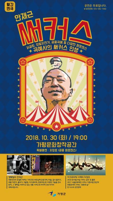 30일 가평읍 종합운동장에 위치한 문화창작공간에서 펼쳐지는 10월 공연에는 영훼밀리 가족서커스팀의 일원으로 시작해 50여 년 동안 서커스를 해온 곡예사 안재근 씨의 인생이야기를 다양한 서커스 기술과 곡예로 표출할 예정이다.
