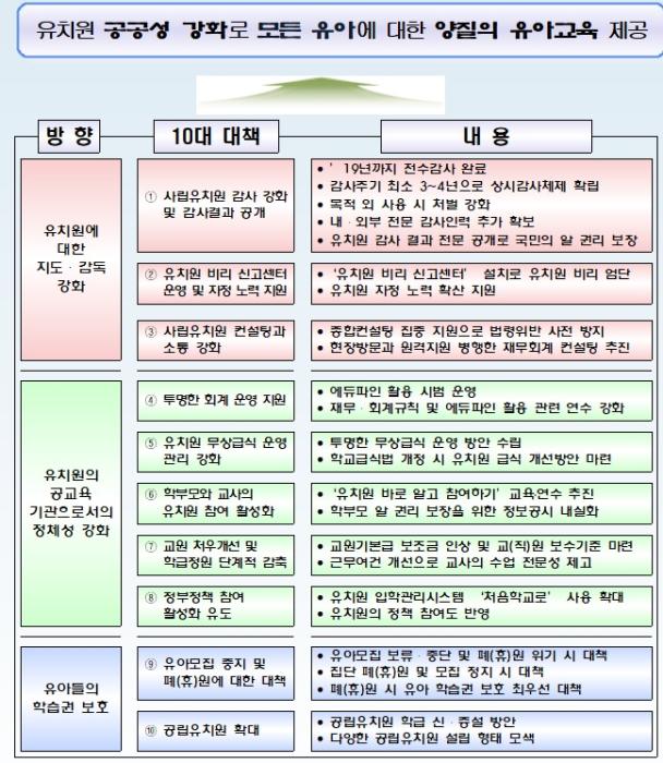 또한 정부 재정 투입확대에 따른 교육기관으로서의 책무성이 요구되고 유치원의 양적 확대와 함께 공공성이 강화된 질적 혁신이 필요함에 따라, 인천시교육청은 ‘유치원에 대한 지도·감독 강화, 유치원의 공교육 기관으로서의 정체성 강화, 유아들의 학습권 보호’ 세 가지의 방향을 설정하고 10대 대책을 마련했다고 했다.