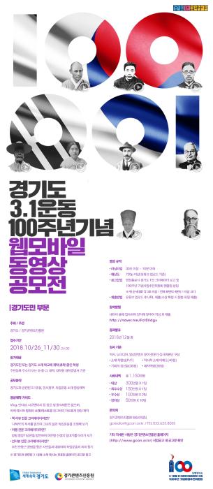 경기도와 경기콘텐츠진흥원이 내년이면 100주년을 맞는 3.1운동을 기념하기 위해 ‘경기도 3.1운동 100주년 기념 웹‧모바일 동영상 공모전’을 개최한다.