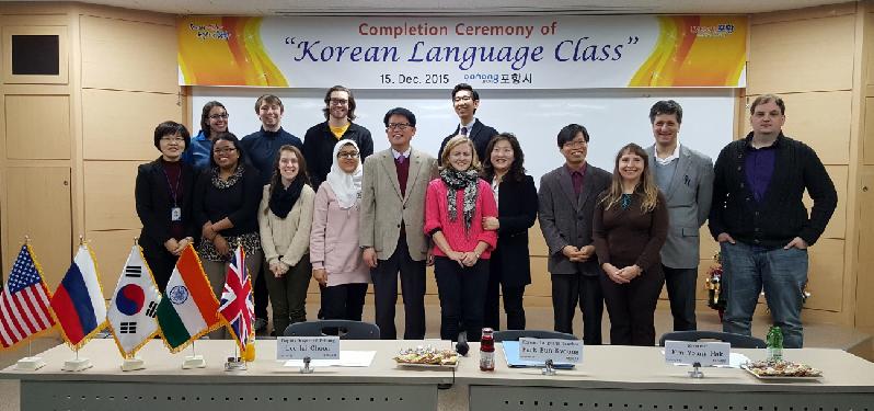 포항시가 15일 포항시청 글로벌센터 제1강의실에서 ‘2015년 하반기 외국인 한국어교실 수료식’을 가졌다. 시는 영어권 외국인을 대상으로 한국어 실력 향상 및 지역사회 적응을 통한 포항시민과의 화합을 돕기 위해 지난 9월 8일 외국인 한국어교실을 개강하였으며 3개월간의 수업 과정을 마쳤다.