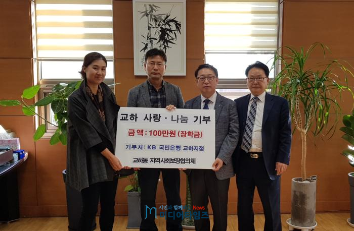 파주시 교하동 행정복지센터는 지난 26일 KB국민은행 교하지점(지점장 김동수)에서 이웃돕기 성금 100만원을 기탁했다고 밝혔다.