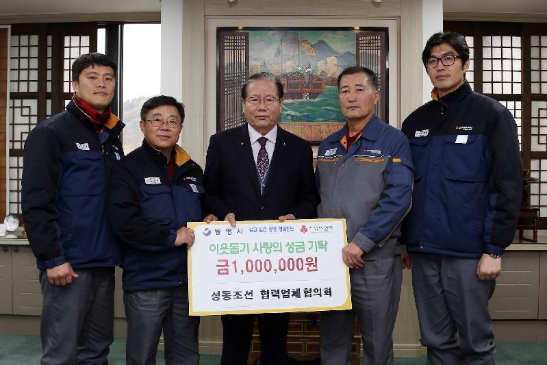 성동조선해양(주) 협력사협의회(회장 김종진)에서 연말을 맞아 지난 12월 15일 통영시(시장 김동진)와 경상남도사회복지공동모금회가 연계 추진 중인 “살고 싶은 통영 행복펀드” 나눔사업에 이웃돕기성금 100만원을 기탁했다.
