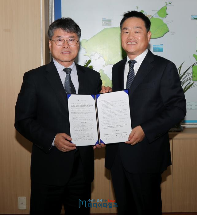 | 홍인성 중구청장과 황윤하 대표가 협약식에서 기념 촬영을 하고 있다.. <사진=인천 중구청 제공> |