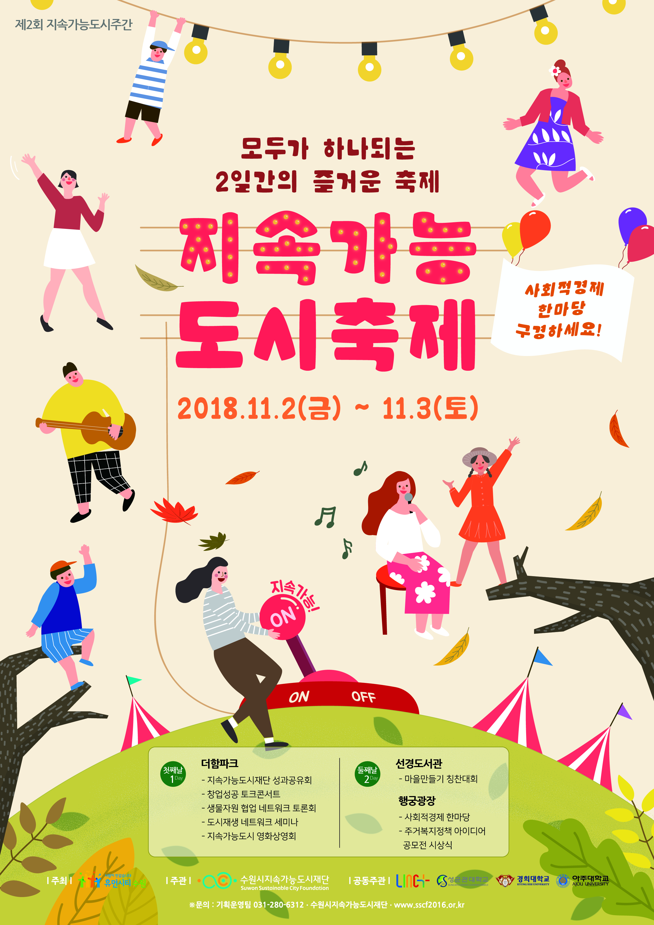 ‘모두가 하나되는 2일간의 즐거운 축제!’라는 슬로건으로 열리는 지속가능도시 축제는 권선구 더함파크(2일)와 행궁광장(3일)에서 진행된다.