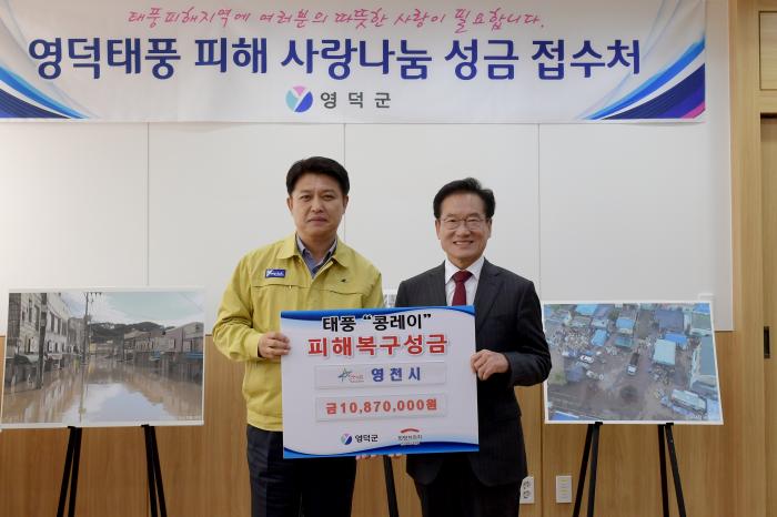 이번 성금은 피해 지역이 빠르게 복구되어 주민들이 안정을 되찾기를 바라는 영천시청 공무원들의 마음이 모아져 모금된 것으로 최기문 영천시장이 영덕군청을 방문해 이희진 영덕군수에게 직접 전달했다.