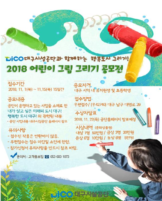 이번 그리기 공모전은 공단이 운영하고 있는 사업을 소재로 ‘내가 살고 싶은 미래의 도시 대구! 행복한 도시 대구!’를 어린이의 눈높이에 맞추어 직접 그리고, 어린이들의 상상력과 꿈을 키워주기 위해 개최하게 되었다.