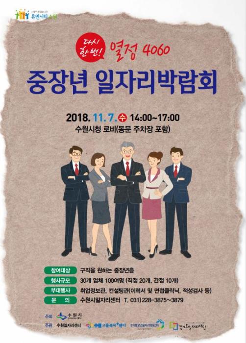 수원시는 오는 7일(수) 오후 2시부터 5시까지 시청 로비와 동문 주차장에서 ‘다시 한번! 열정 4060 중장년일자리박람회’를 연다.