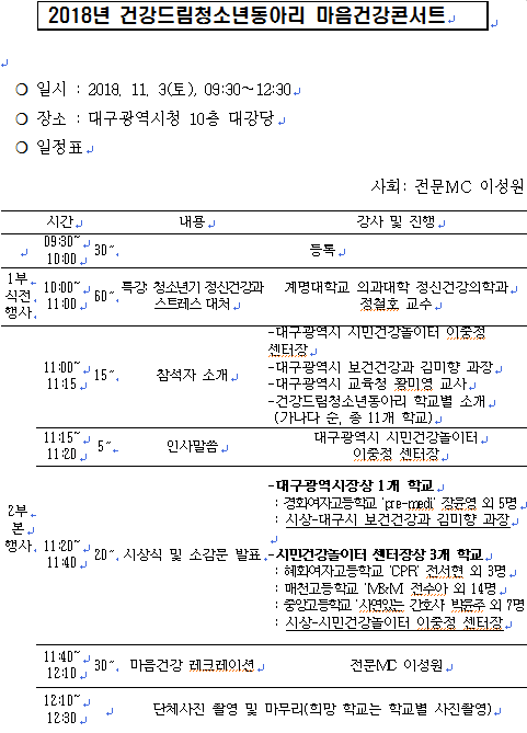 대구시는, 시청 10층 대회의실에서 보건의료관련학과 진학을 꿈꾸는 건강드림청소년동아리 청소년건강리더 120여명을 대상으로 마음건강콘서트를 진행했다. 이번 행사는 OECD 국가 자살률 1위, 입시를 앞둔 청소년기의 우울감 상승 등 다양한 정신적 문제를 안고 있는 청소년들을 대상으로 자존감 상승, 자신감 고취를 위한 계기를 마련하기 위해 특별히 기획되었다.