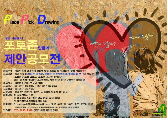 포토존 조성은 안성시체육관, 안성종합운동장, 안성맞춤캠핑장, 안성시국민체육센터, 안성시사계절썰매장으로 총5개소 시설물에 포토존을 설치할 공간과 어울릴 만한 디자인을 스케치 하여 공모전 신청서와 함께 작품을 제출하면 된다.