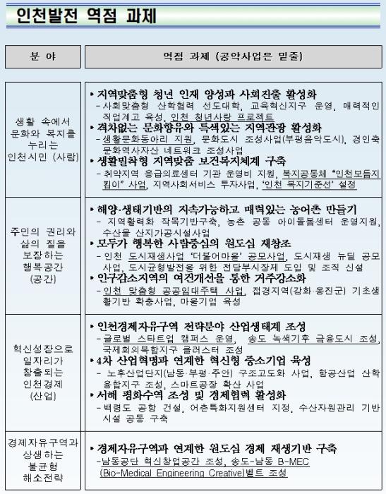 인천시 발전 5개년 계획은 중앙정부 재정지원사업과 인천시 자체사업을 총괄하는 종합계획이다. 주요 사업으로는 도시재생 뉴딜 공모사업, 지역사회서비스 투자사업, 국제회의복합지구 클러스터 조성 등 국비와 연계한 사업과 함께 인천시 자체사업인 ‘더불어 마을’공모 사업, 생활문화동아리사업, 인천 맞춤형 공공임대주택사업 등이 포함되어 있다.