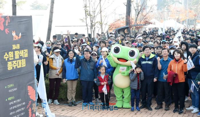 | ‘제4회 팔색길 종주대회’ 출발에 앞서 염태영 수원시장(수원이 탈인형 오른쪽)이 시민들과 함께 기념 촬영을 하고 있다. |