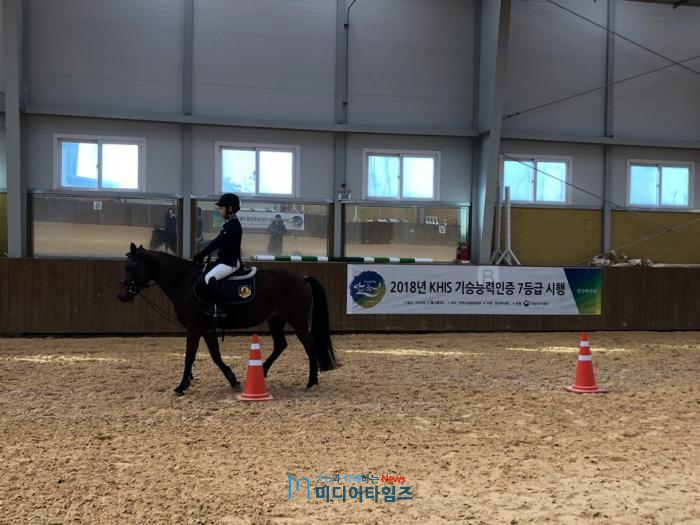 이날 기승능력인증 7등급 시험은 승마산업 저변확대를 위해 승마에 입문한 유소년과 성인 등 50여명을 대상으로 말 돌보기, 말과 함께 걷기, 말정리하기, 말타기 등 말의 특성을 이해하고 교감하는 다양한 부분에 대해 필기와 실기 평가로 진행했다.