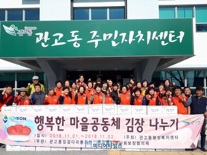 이천시 관고동 징검다리봉사단(단장 김경숙), 관고동 지역사회보장협의체(공동위원장 윤희태, 임준규), 시민 등 50여 명은 지난 1일 부터 2일 까지 이틀간 외롭고 어려운 이웃에게 사랑의 마음을 전하기 위한 행복한 마을공동체 김장 나누기 행사를 실시했다.