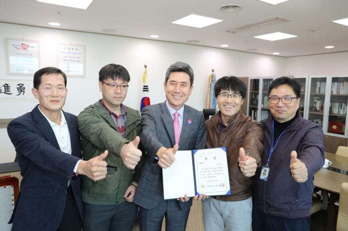 이강덕 포항시장(가운데)와 (왼쪽부터)이광희 자원순환과장, 자원순환과 자원재활용팀원 및 팀장이 ‘2018 재활용가능자원 회수선별실적 평가’에서 수상한 최우수 상장을 들고 있다.
