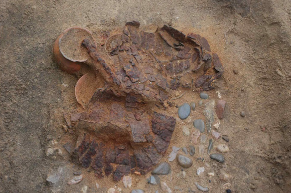 | 토광목곽묘 서쪽에서 발견한 찰갑과 신라 토기(장경호) 모습. (사진=문화재청) |