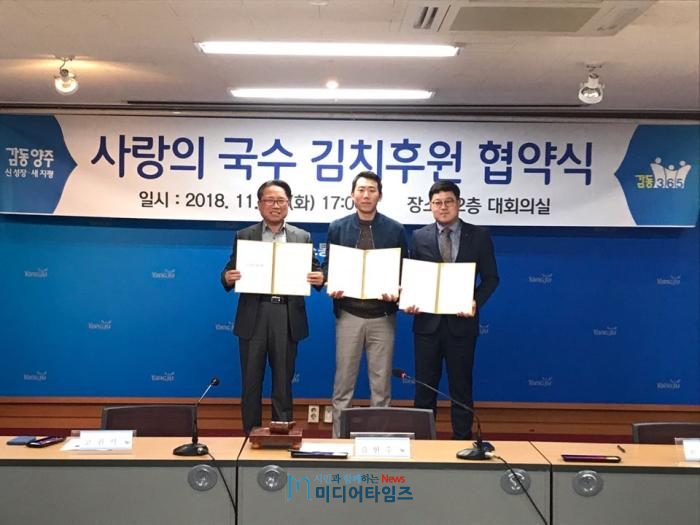 협약을 통해 관내 업체인 감동식품은 회천3동 주민자치위원회에서 주관하는 사랑의 국수 사업에 정기적으로 김치를 후원하기로 했다.