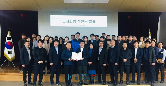 광명도시공사(사장 김종석)는 지난 6일 광명시 소하도서관 대강당에서 전 직원이 참석한 가운데 노사 간 갑질 관행을 근절하고 인권 존중의 기업 문화를 선도하기 위해 상호 신뢰와 협력을 바탕으로 하는 ‘노사화합 선언문’을 발표하고 전문 강사를 초청해 특강을 진행했다.